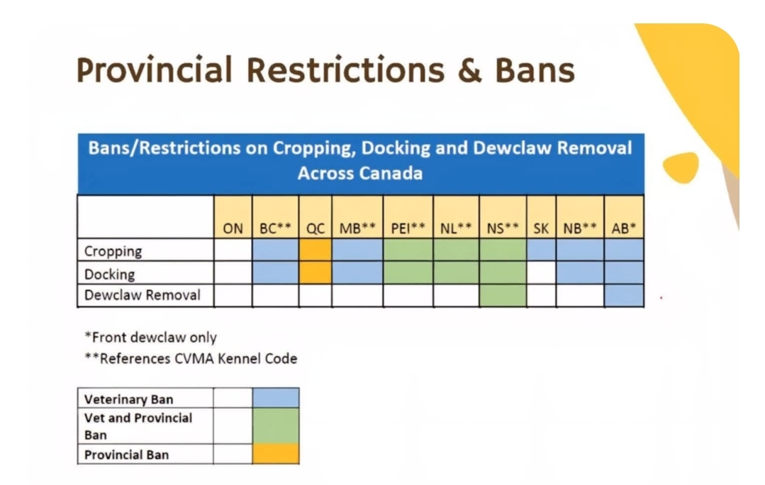 In Canada, the East & West Coast, either the Province and/or the Provinvcial Veterinary Association has banned tail docking. As has, Alberta, Manitoba & Quebec.